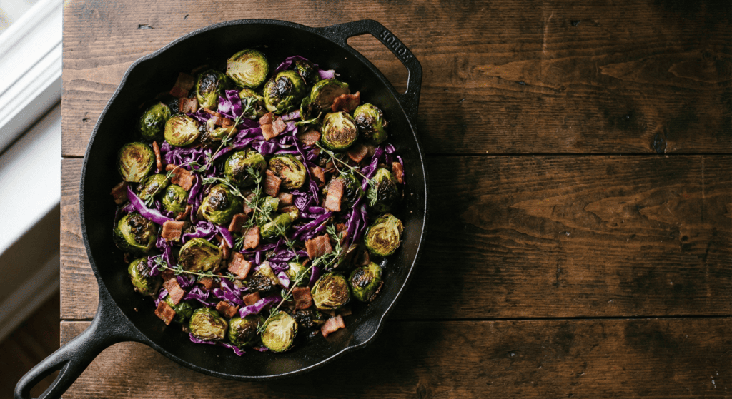 This recipe pairs Brussels sprouts with red cabbage, a combination that works on multiple levels. The cabbage adds sweetness and color, softening while the sprouts crisp at the edges.
