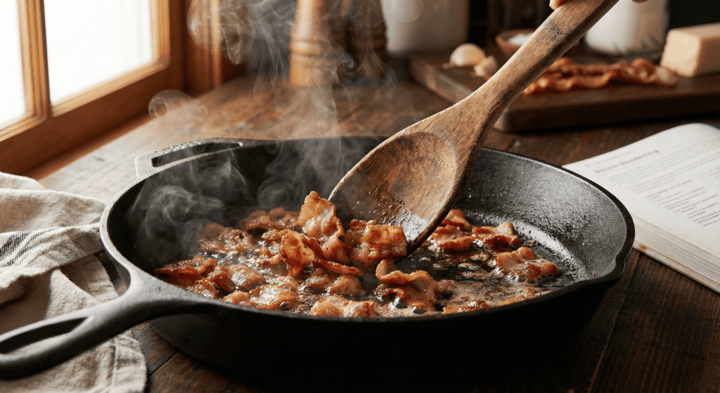 Cook for 6-8 minutes, stirring occasionally, until the bacon is crispy and has released most of its fat. The bacon should be golden brown but not burnt. Use a slotted spoon to transfer the bacon to a paper towel-lined plate. Leave the rendered fat in the pan.