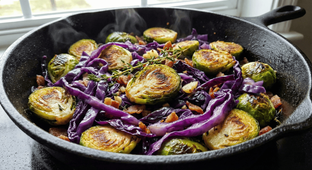 The colors make an impression before anyone takes a bite. Deep purple cabbage against bright green sprouts, studded with golden-brown bacon and flecks of fresh thyme. It looks like a dish that required effort, even though the active cooking time is under 20 minutes.