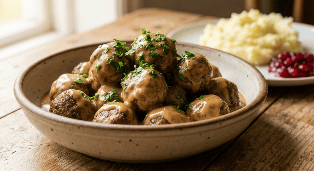 Swedish meatball sauce is lighter in color and richer than standard gravy. It should coat the back of a spoon but still pour easily. The key is building it from the browned bits left in the pan after cooking the meat.